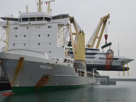 True multi-mode (Ro-Ro / Flo-Flo / Lo-Lo) with a 132.0 × 25.4 m deck and cranes 2 × 350 t + 1 × 200 t (up to 700 t combined); ~16 kn service speed. Suited to yachts, modules, barges and outsized units that benefit from semi-submersible operations.